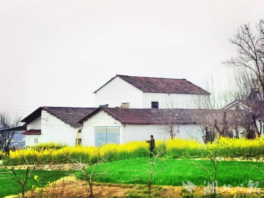 在孙桥镇的梭罗河村,白墙黛瓦旁,油菜花铺展成一派金黄,与田间新绿共同谱写春日絮语。