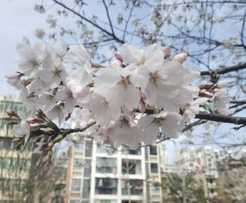 城区南河桥头老机械厂小区的健身步谈旁,樱花缀满枝端,粉白的花簇在晴日里轻颤,将寻常楼宇晕染成蔼然的诗行。