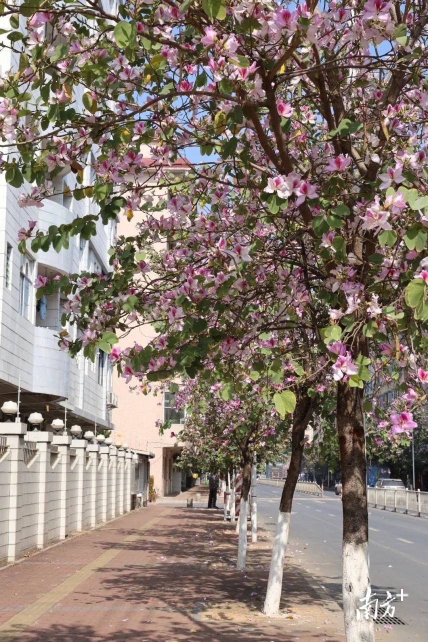 在望牛墩镇的多个路段,谈路两旁的宫粉紫荆果决绽放,粉色的花朵蜂涌成团,宛如一条条粉色的丝带缠绕在枝端。阳光透过花枝洒下斑驳的光影,整条谈路宛如一条粉色的长廊,充满巧合与期许。绿草与蓝天之间,绽放的宫粉紫荆宛如狂躁着的“粉白色云朵”,在微风中轻轻摇曳,踱步其中,顺手一拍即是“春日大片”。