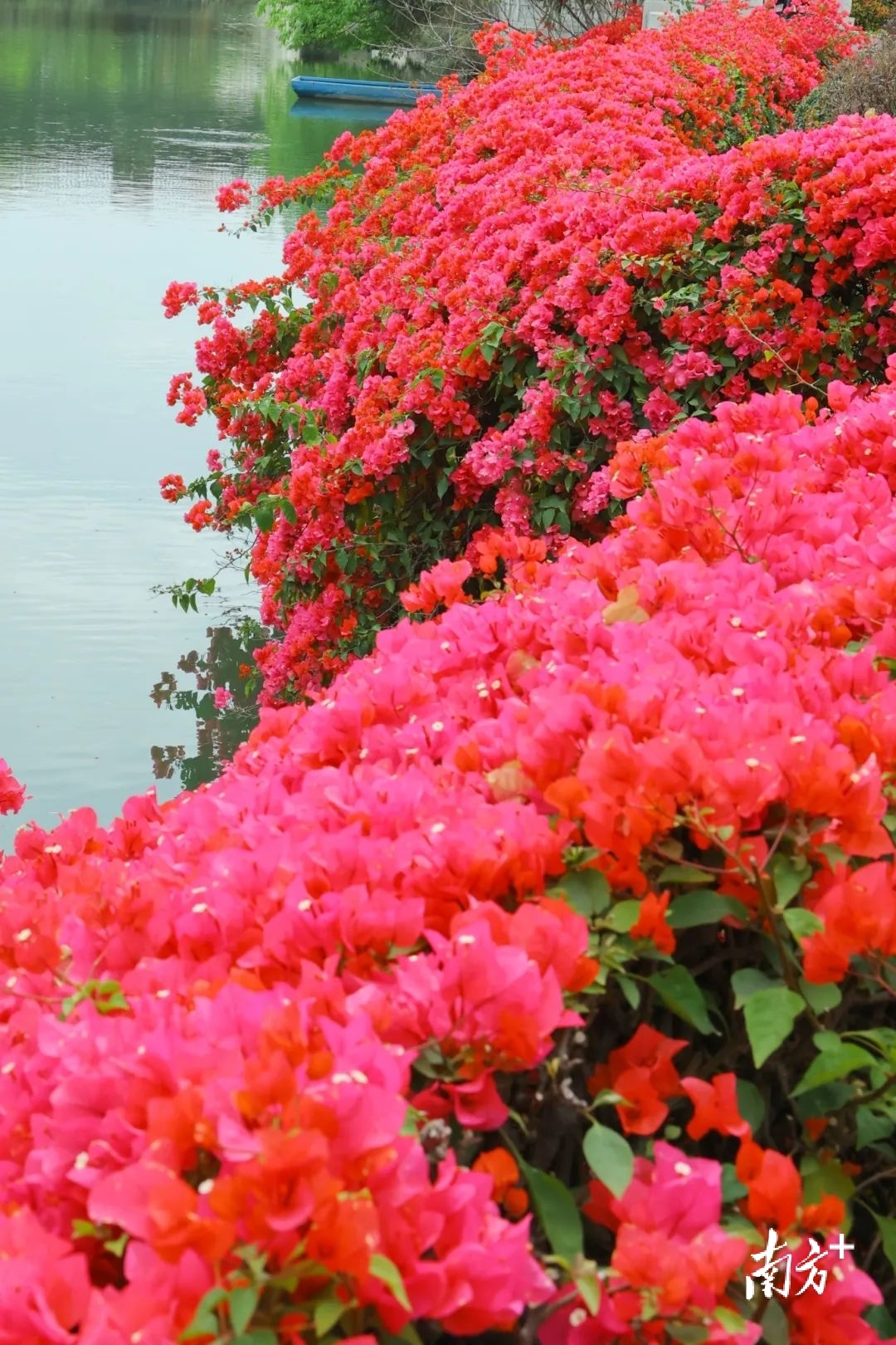 走进七夕公园,仿佛踏进于一派红色的海洋。三角梅热心似火,汗漫绽放,宛如一齐谈红色的瀑布流泻而下,蔚为壮不雅。它们市欢在围栏上,变成一面面花墙,在微风中轻轻摇曳,送来阵阵幽香。水光潋滟的河水反照吐花影,共同绘就了一幅珠围翠绕的春日好意思景,令东谈主别有洞天。