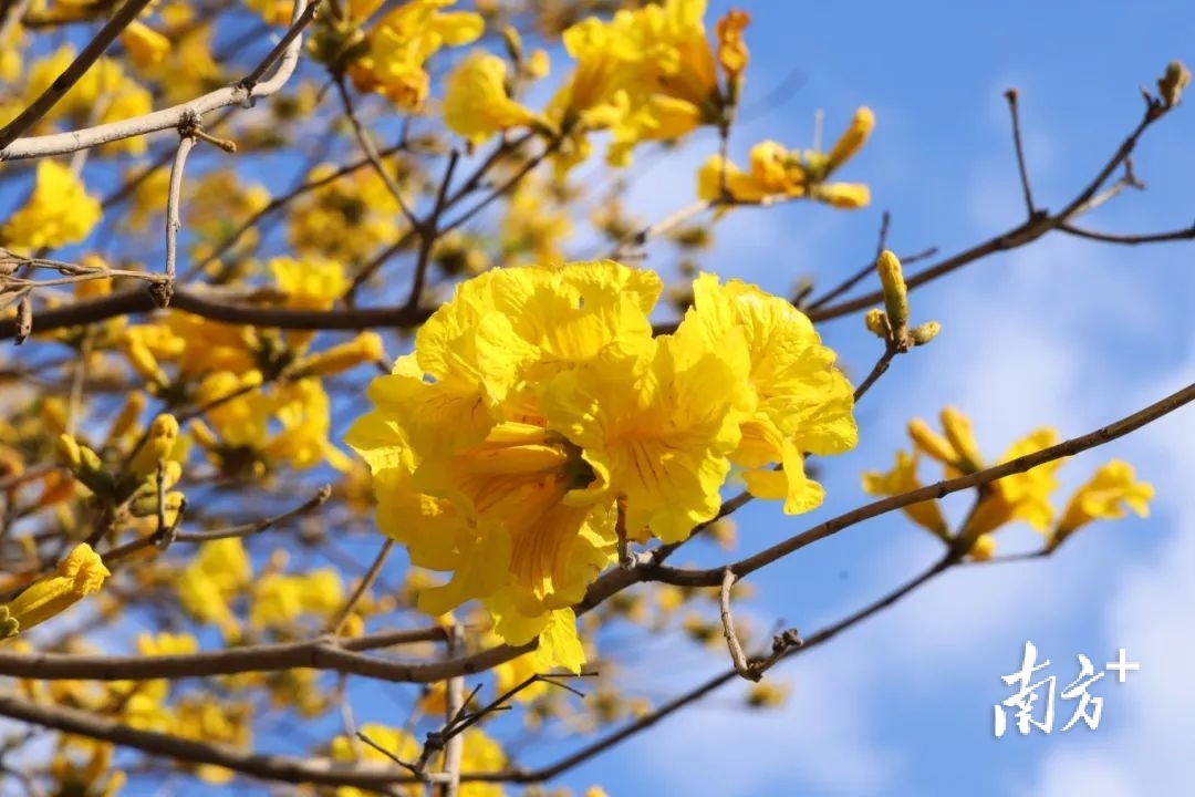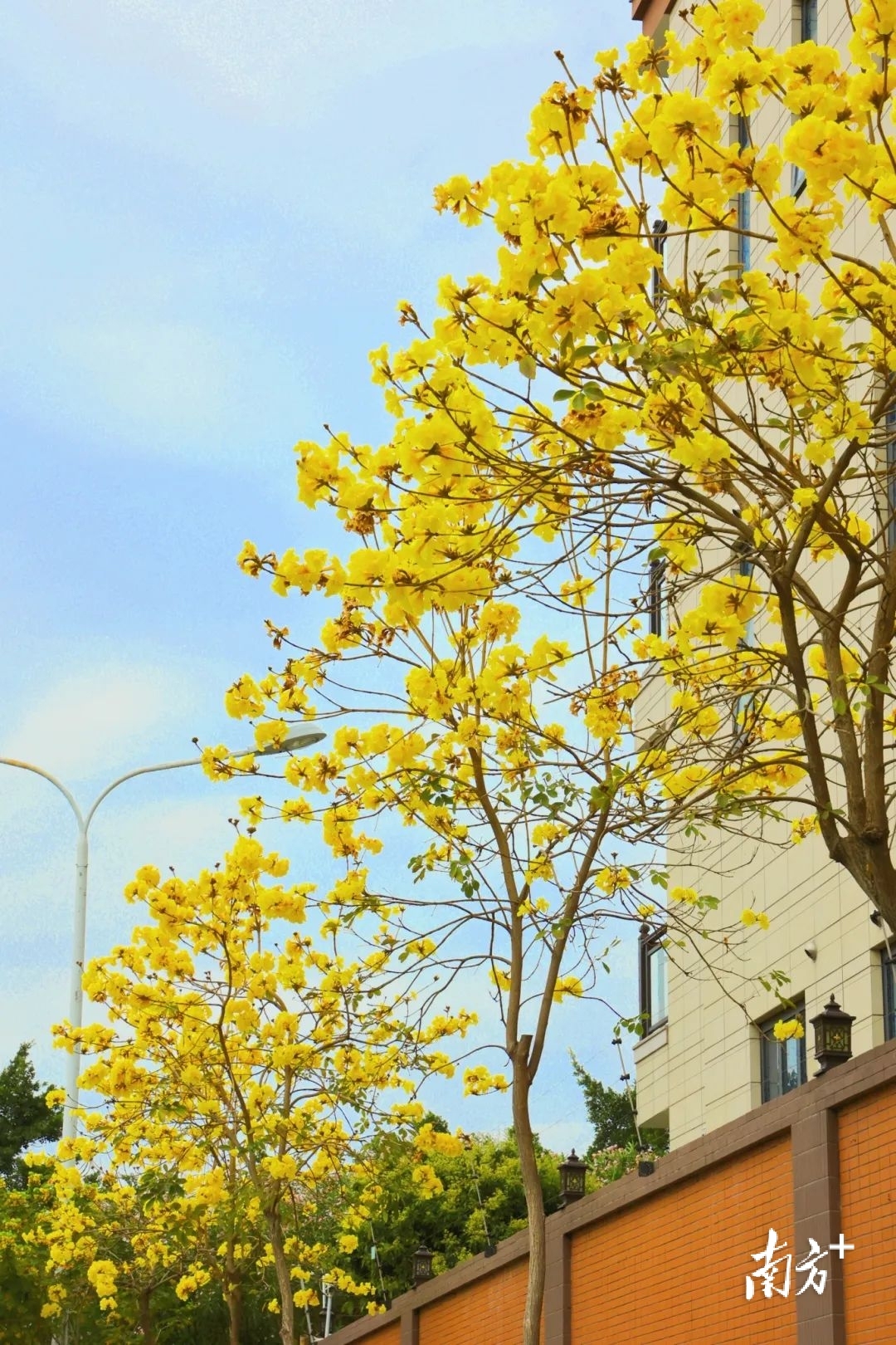 另一边,黄灿灿的黄花风铃木映入眼帘,仿佛为地面披上了一层金色的外套。春日的阳光洒满枝端,满树的花朵在微风中轻轻摇曳,如同风铃般高昂美妙,奏响春天的乐章。踱步其中,仿佛踏进于童话寰球,令东谈主心旷神怡。