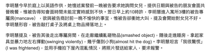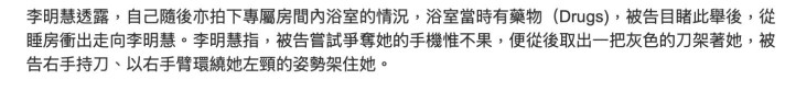 李聪明还称陈燿阳走出房间后,又在走廊乱砸物品,接着又走到睡房提起产品暴力地傍边摇动,还确切伤害了家中的宠物狗。李聪明暗意那时我方很慌张,于是用手机拍下了家中参差的情况,将相片发给家东说念主条目报警。而着实让陈燿阳感情爆发的事情是,李聪明拍下浴室中有药物,陈燿阳发现后就从睡房走出要抢李聪明的手机,未果之后提起了一把灰色刀子架在李聪明的脖子上,其中右手绕着李聪明的脖子,架着她。李聪明那时坐窝招呼外佣襄助,在外佣赶到前,陈燿阳放下手中刀子,但接续架着李聪明,在外佣的劝说下,陈燿阳才放开了李聪明,况且拨打电话,还怒冲冲地对着李聪明称要干掉她。