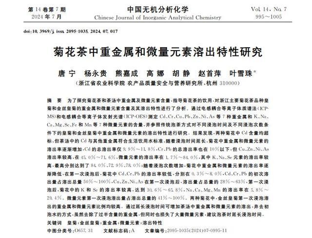[1] 唐宁.菊花茶中重金属和微量元素溶出特质磋议, 中国无机分析化学, 2024-02-23