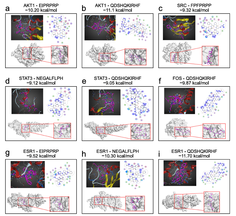 随后联结有关算法进一步筛选,锁定其中5条活性更为卓著的中枢肽段。进一步的靶点展望扫尾线路,这些肽段共关系134个潜在作用位点,触及AKT1、STAT3、NFKB1等多条与代谢调控及炎症反应密切有关的要害信号通路。