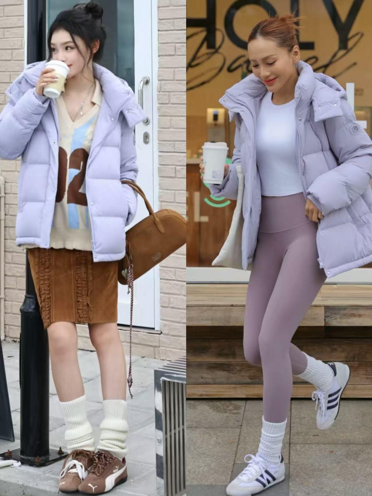 右边这位凯旋弃取了粉紫色的无痕裤来搭配上灰紫色的羽绒服外衣,这样的搭配不太相宜中年女性,可能你以为念念要呈现出一种开通风,但很容易呈现出窘态感,穿外出不是那么的多礼。